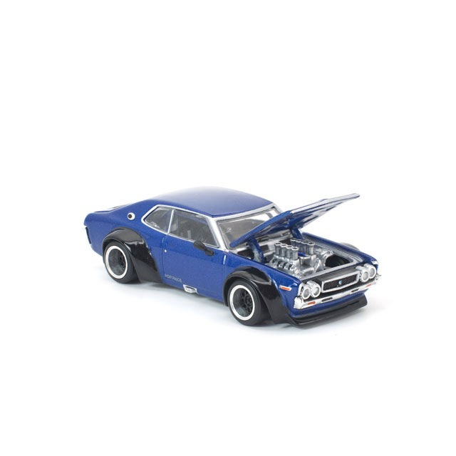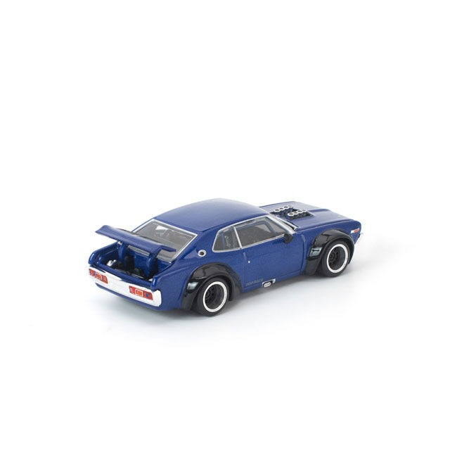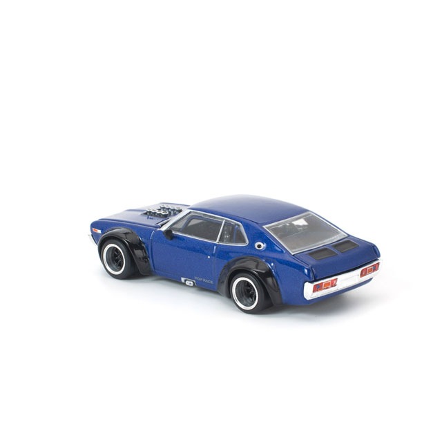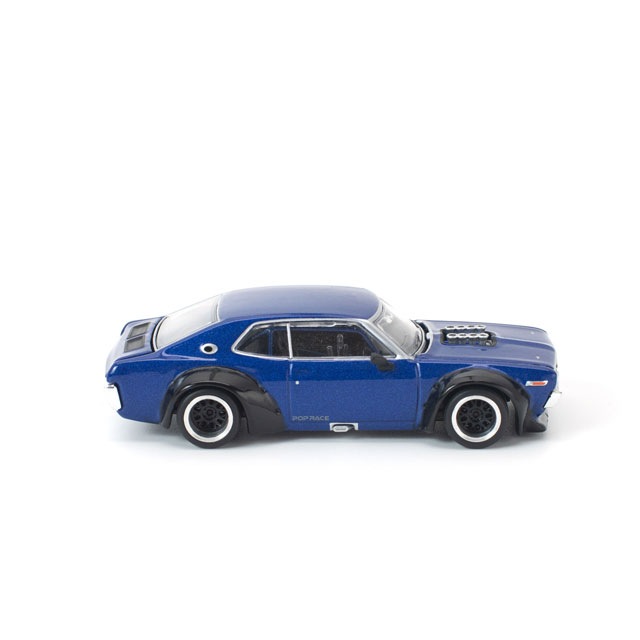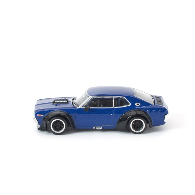 ●POP RACE独自の解釈でリイマジンされたC130 ローレルに、深みのあるネイビーブルーとグロッシーブラックのオーバーフェンダーを組み合わせた新カラーが登場。ワイドボディ化された迫力あるスタイルを、1/64スケールで精密に再現。フロントフードおよびリアトランクの開閉ギミックを搭載し、内部には細部まで作り込まれたエンジンディテールを備えています。