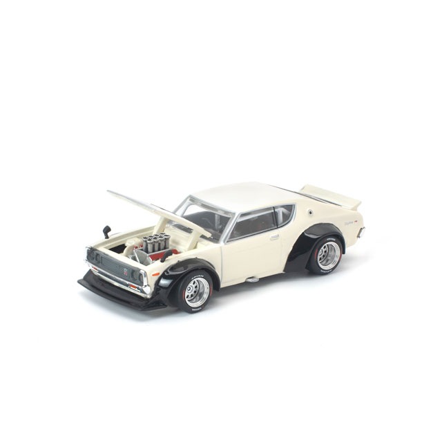 ●POP RACEが独自にカスタムビルドした「ケンメリ」が、ホワイトカラーで登場。迫力あるワイドボディに加え、NASCAR由来のV8エンジンを搭載した特別仕様で、日本車のクラシックデザインとアメリカンマッスルの魅力を融合させた一台です。モデルはフロントフードおよびリアトランクの開閉ギミックを備え、内部には精密に再現されたエンジンディテールを搭載。存在感あふれるスタイルとメカニカルな魅力を兼ね備えた、コレクター必見のモデルとなっています。※本製品はライセンサー監修のもと開発中のため、仕様および細部は予告なく変更となる場合があります。