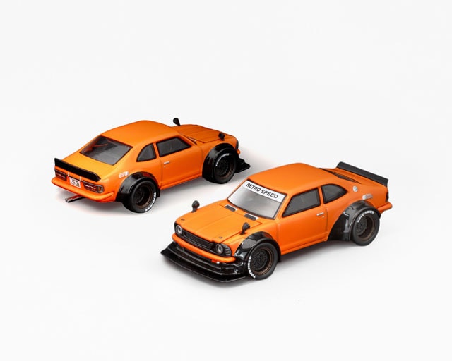 ●約60年にわたり世界中で愛され続けるベストセラーモデル「トヨタ・カローラ」は、カスタマイズベースとしても高い人気を誇ります。今回POP RACEから登場するのは、完全新規金型による1/64スケール「カローラ KE25 ワイドボディ仕様」。 鮮やかなオレンジのボディに、光沢ブラックのオーバーフェンダーとカーボン調エアロキットを組み合わせ、存在感抜群の仕上がりとなっています。さらに、開閉式ボンネットを備え、内部には精密に再現されたエンジンディテールを楽しむことができます。
